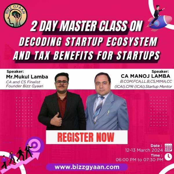 This 2-day master class is designed to help individuals understand and decipher the complexities of the startup ecosystem and the various tax benefits available for startups. Whether you're an aspiring entrepreneur or an Working Professionla,this course will provide you with the knowledge and insights needed to navigate the startup landscape effectively. Led by industry experts with extensive experience in startups and taxation, this master class will cover topics such as understanding the startup ecosystem, analyzing market trends, identifying funding opportunities, and maximizing tax benefits for startups. By the end of this course, you will have a comprehensive understanding of the startup ecosystem and the tax benefits that can help your startup thrive.